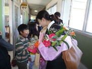 児童から花束が贈られ、全校生や保護者の皆さんに見送られながら新天地へ旅立ちました。新しい環境でのみなさんのご活躍を期待しております。