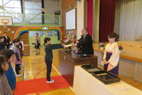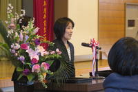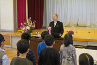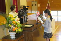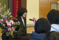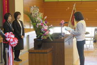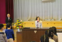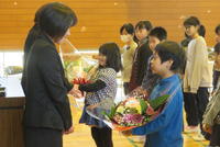 転・退職される先生方からご挨拶をいただいた後、児童代表の宗像さんからは送別のことばが、遠藤君と村上さんからは花束の贈呈がありました。