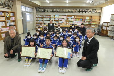 全校集会に先立って、ライオンズクラブ主催の「国際平和ポスターコンクール」に入選した本校児童3名の表彰を行っていただきました。