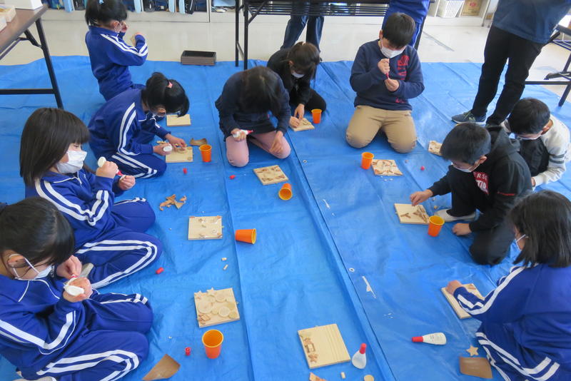 1・2年生は木工クラフト,3・4年生はマイカー貯金箱を制作しました。