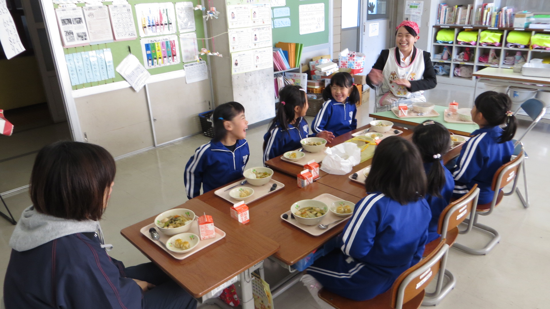 児童たちは珍しいお客様に大喜びで、いつもより賑やかな給食になりました。