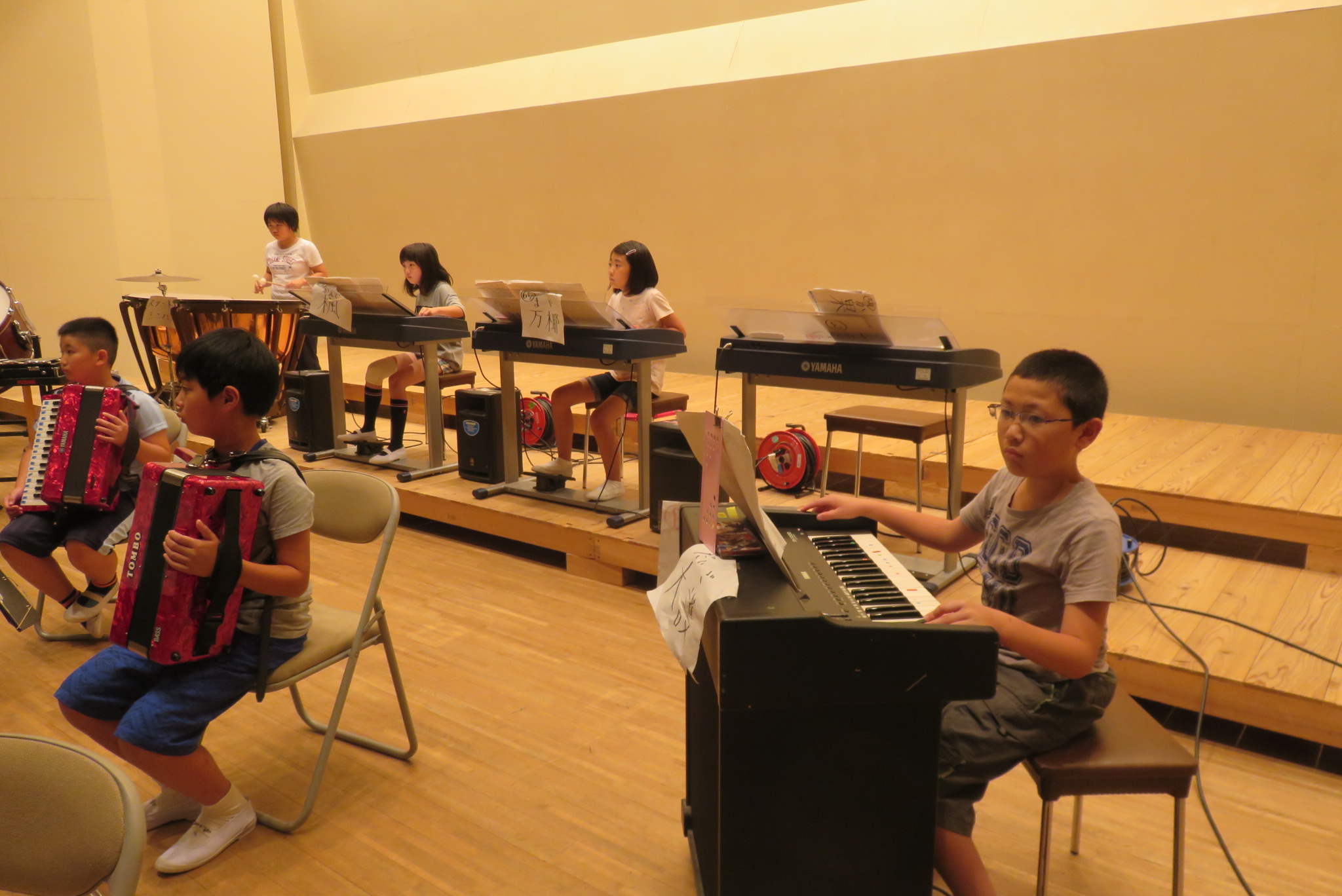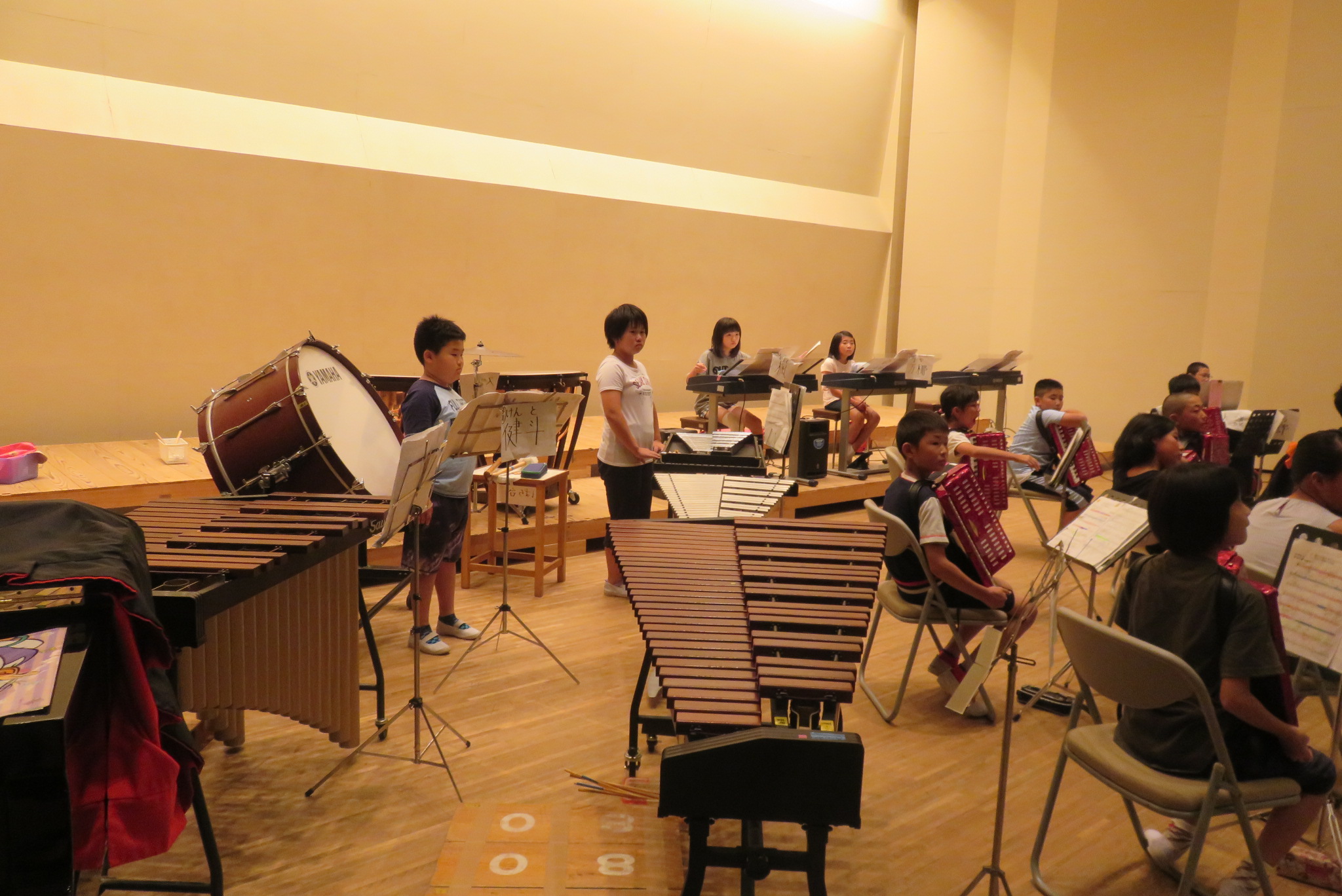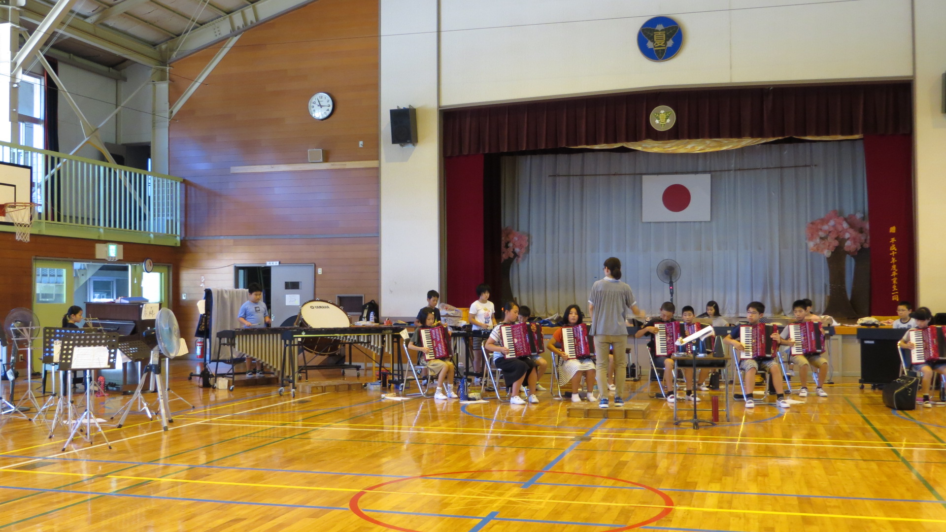 事前に会場で練習できるのは1回だけとあって、児童たちは真剣に練習に取り組んでいました。