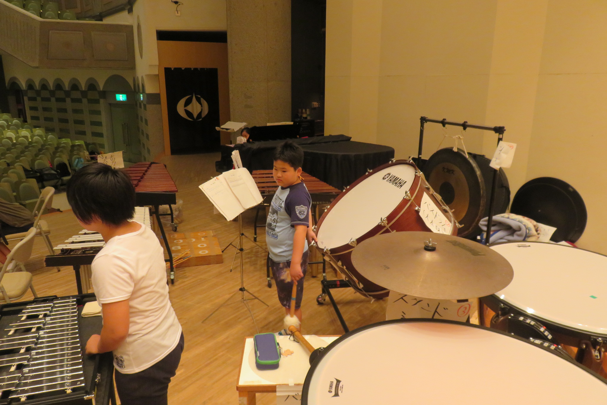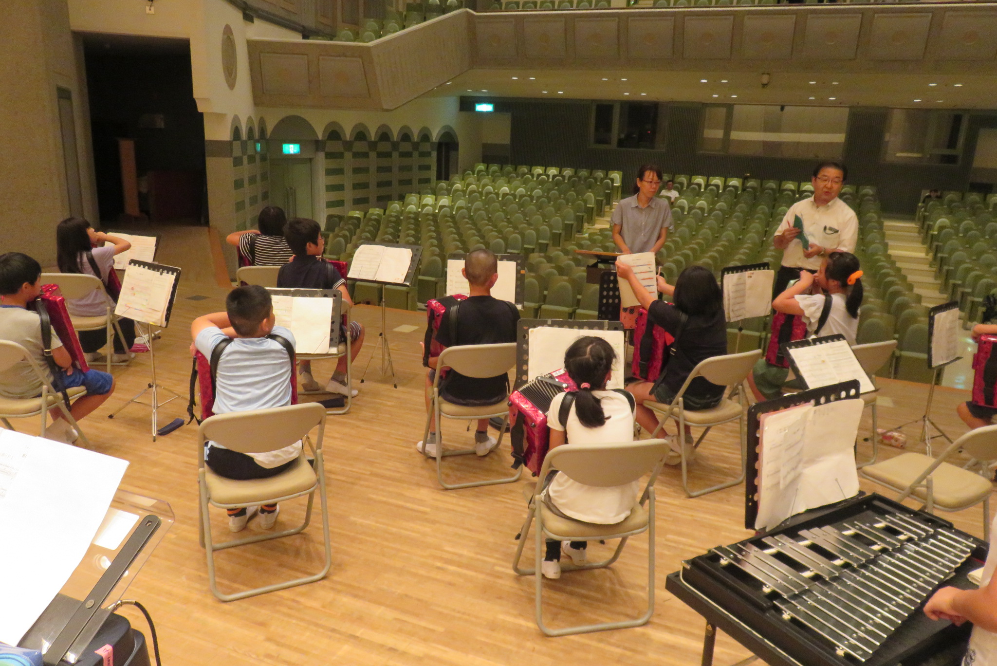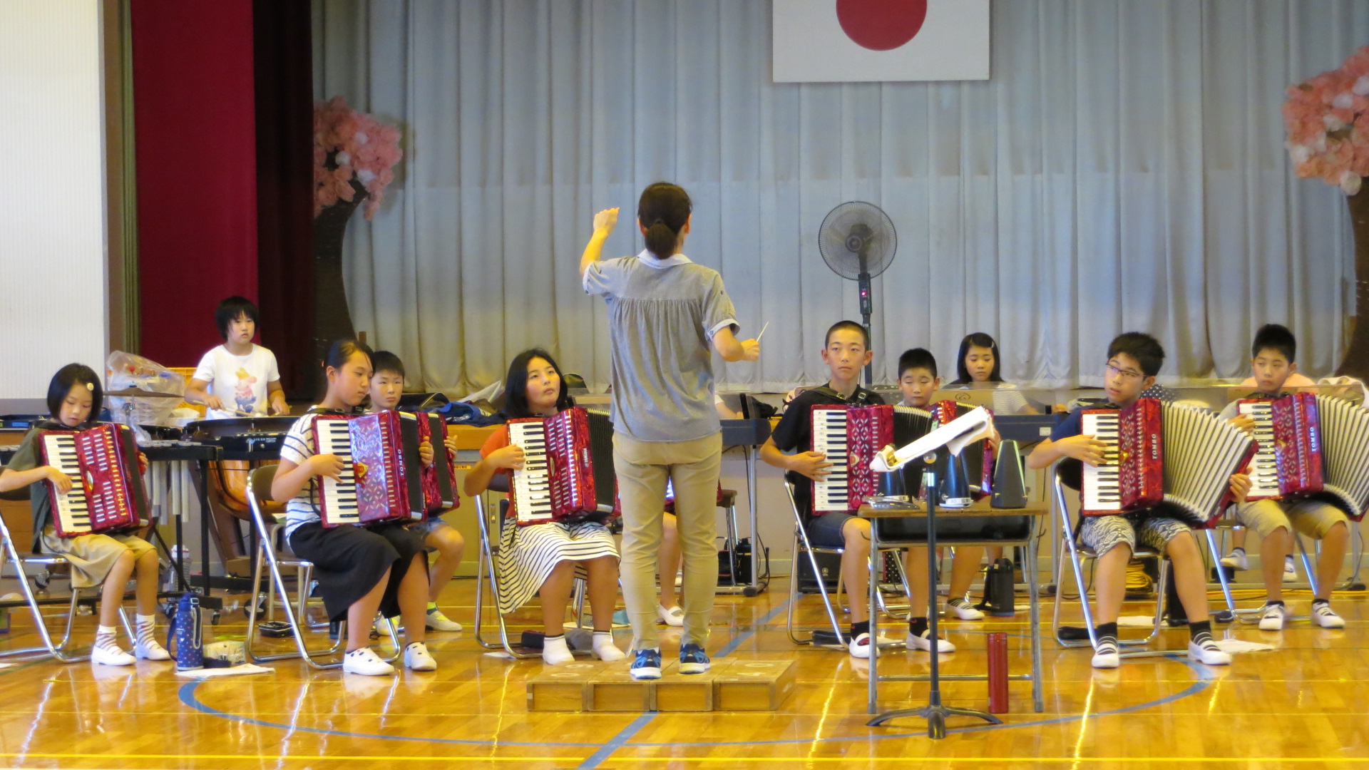 事前に会場で練習できるのは1回だけとあって、児童たちは真剣に練習に取り組んでいました。