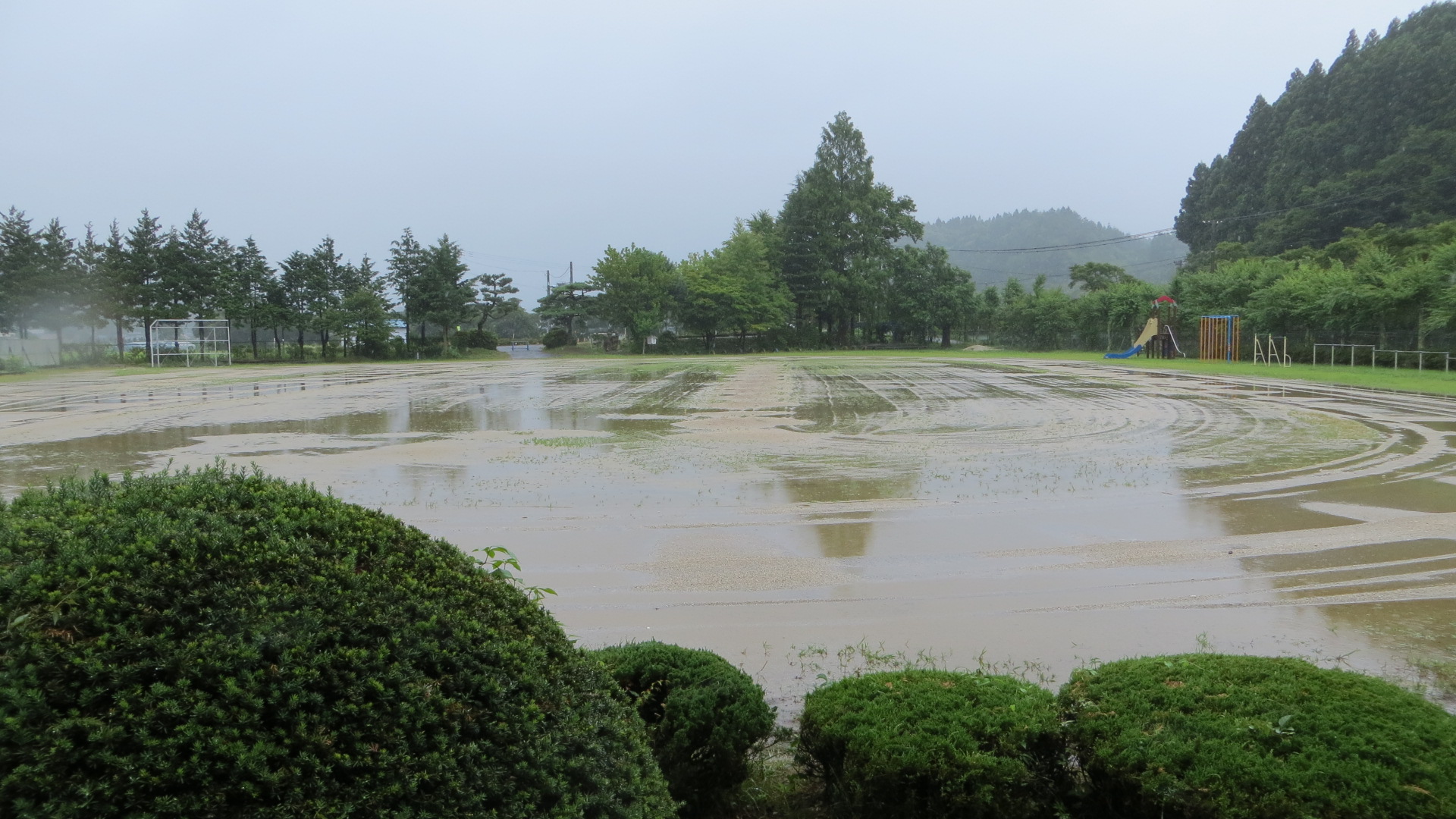 学校脇の夏井川もだいぶ増水してきました。校庭の水たまりも大きくなってきました。