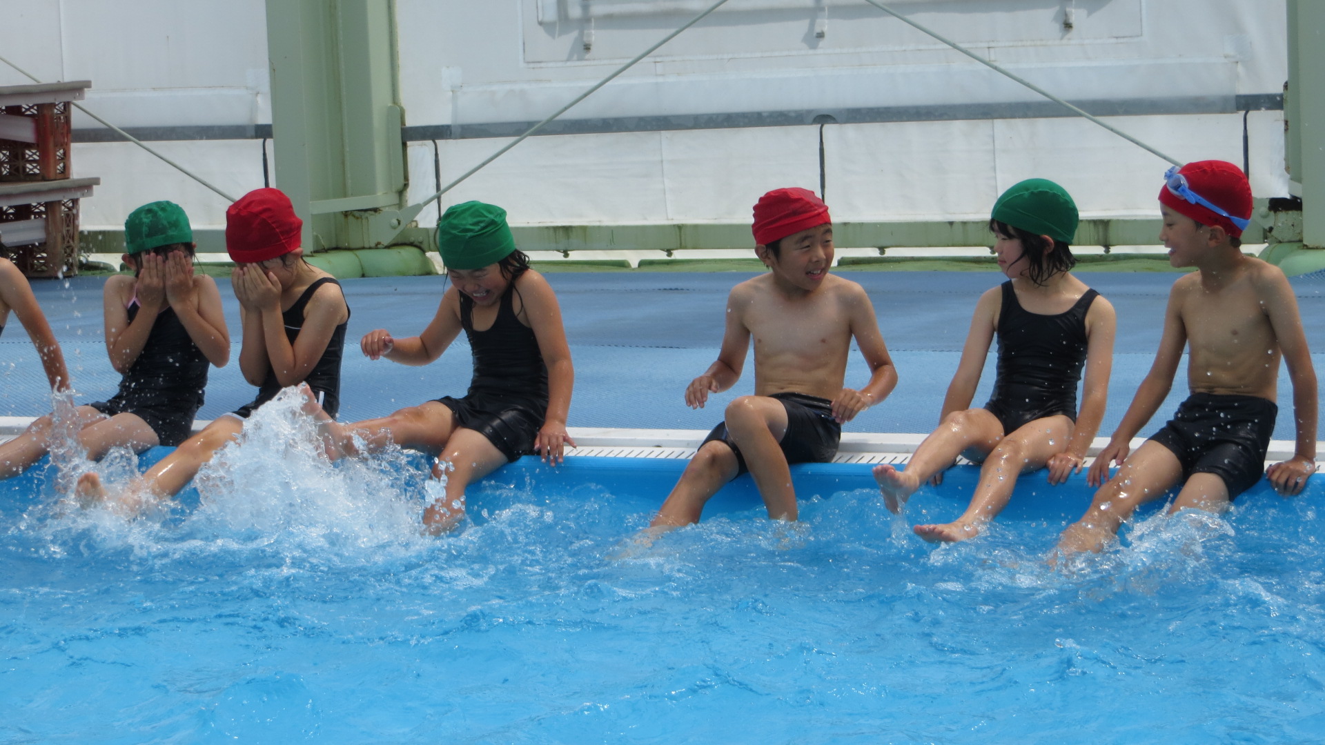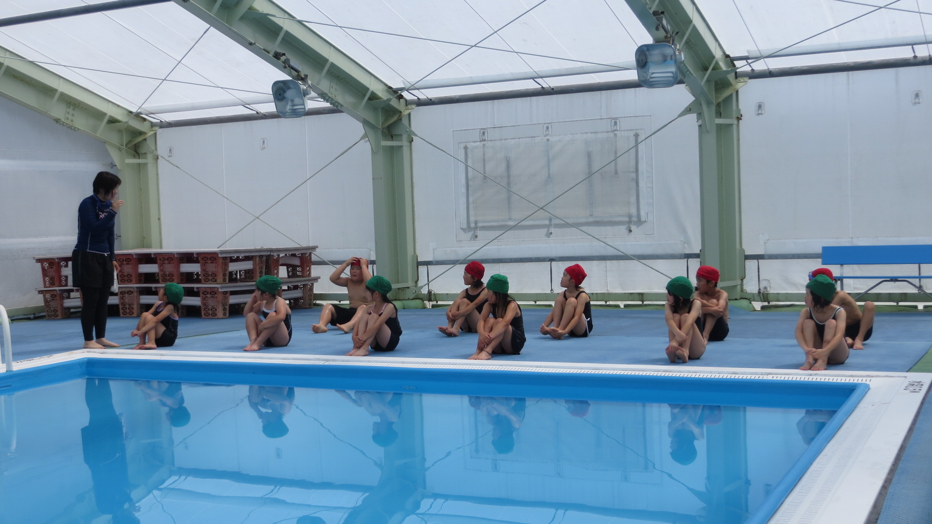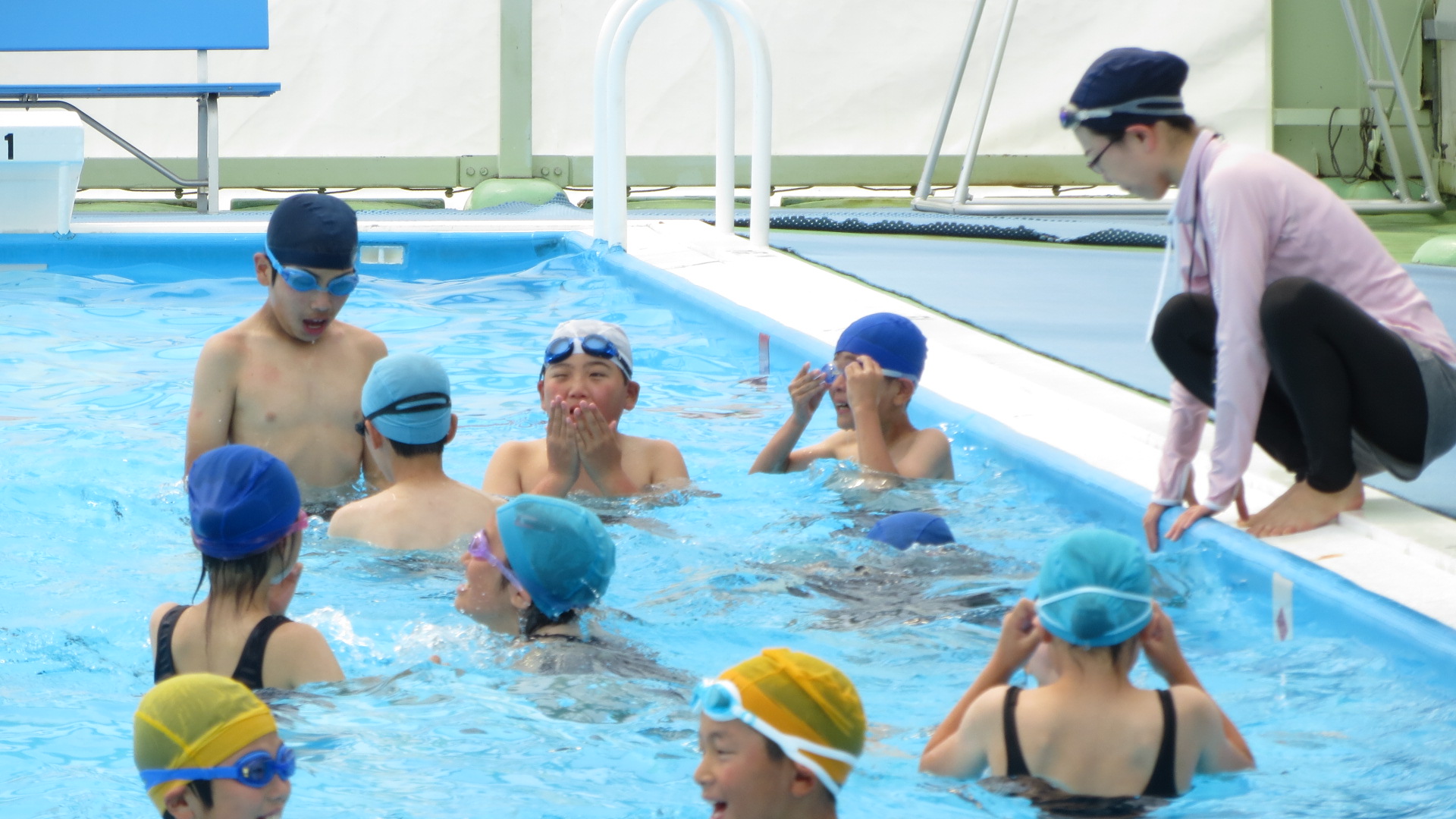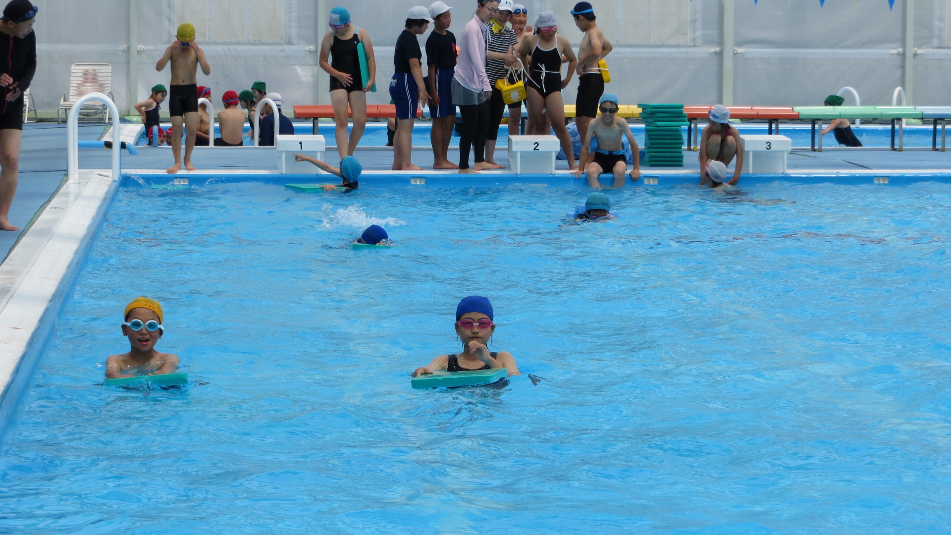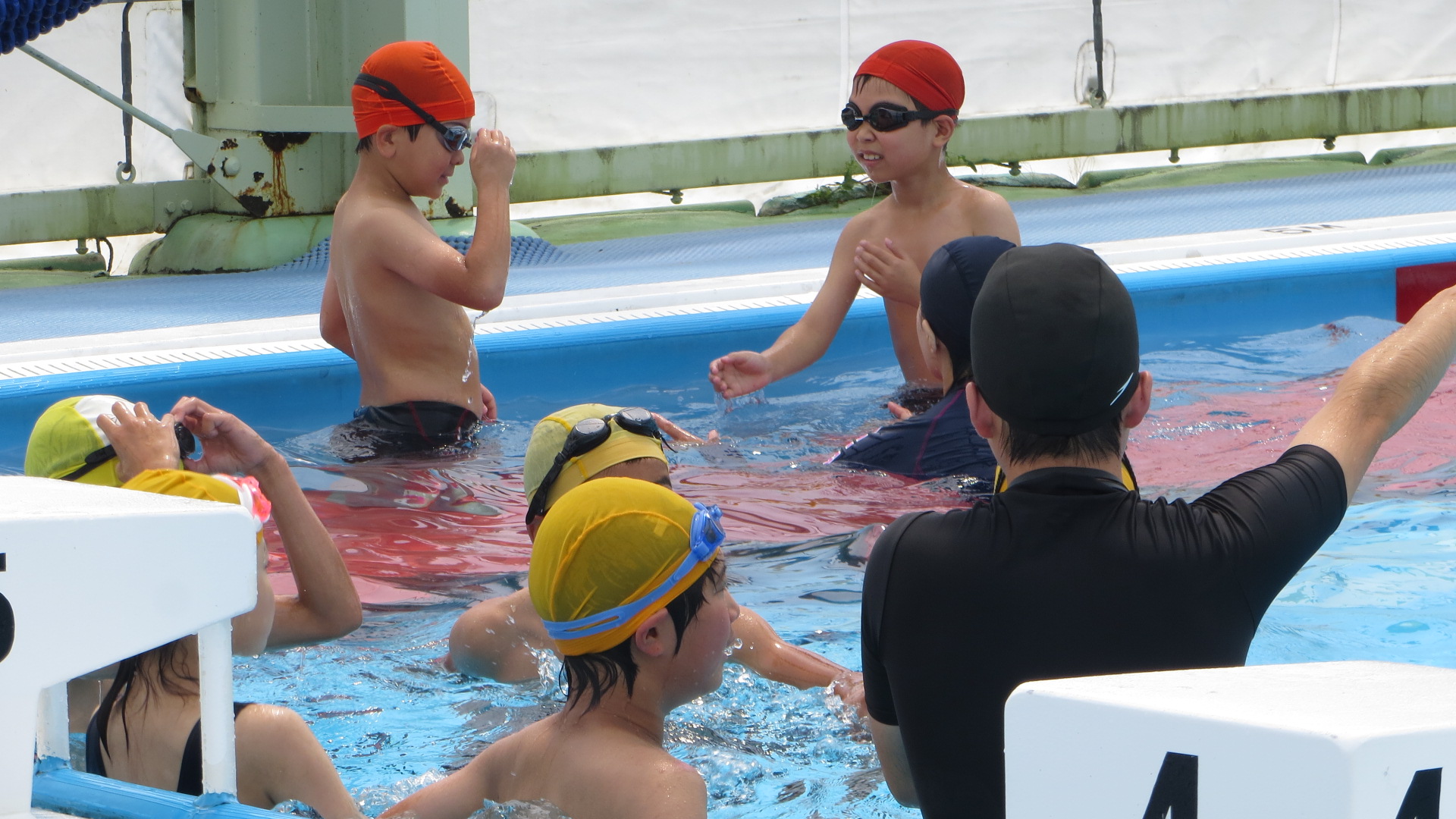 晴天のせいでBGプール内は気温40度ぐらいありましたが、水温はちょうどいいようで子どもたちは学年に分かれて、楽しそうに授業を受けていました。