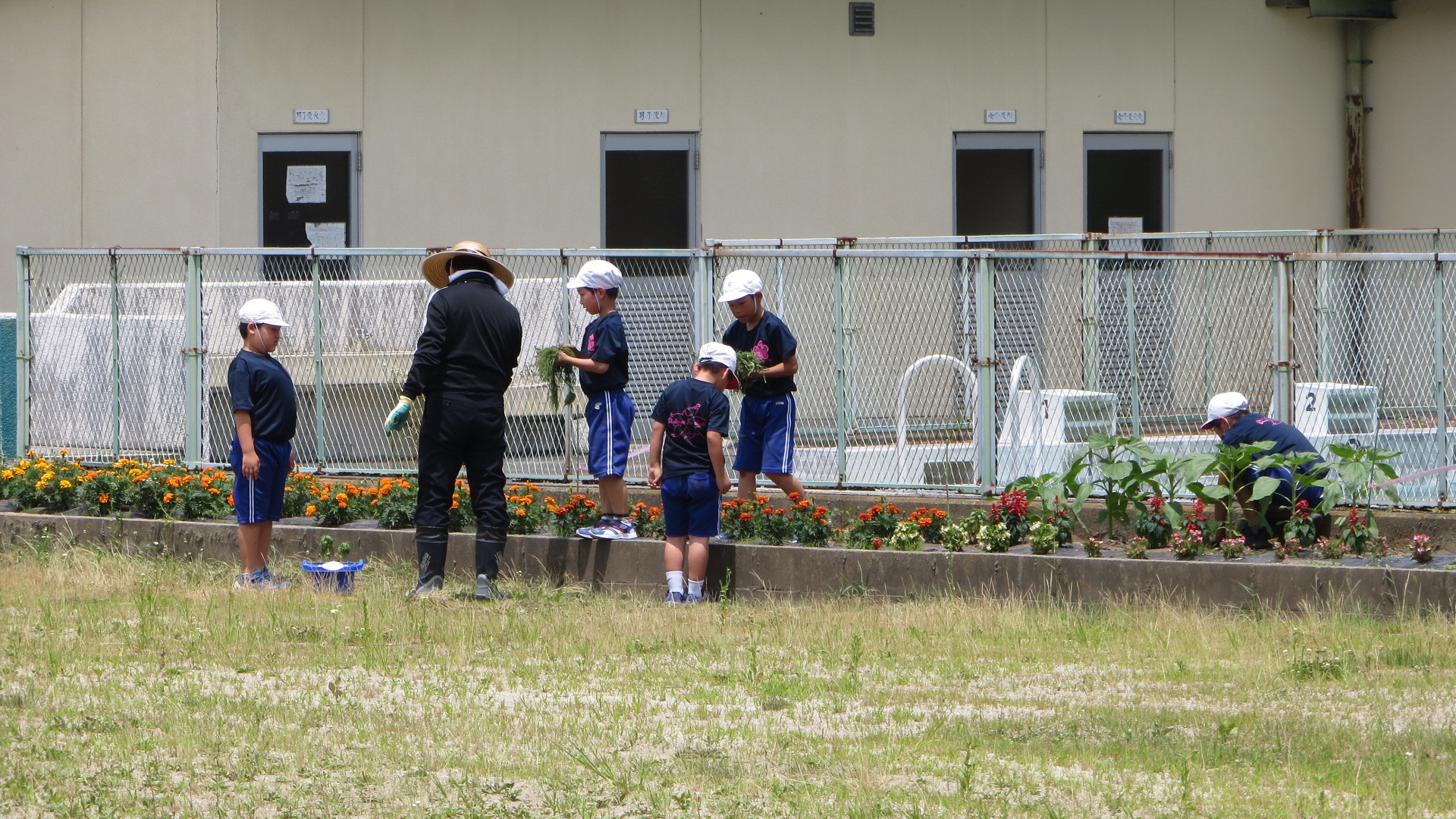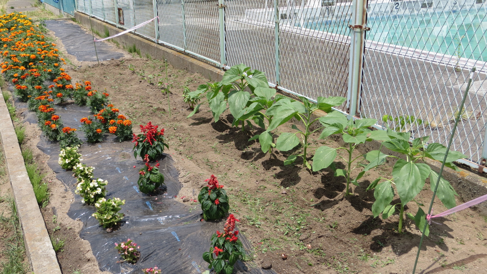花壇には、ヒマワリ・ホウセンカ・ワタなどが植えられています。