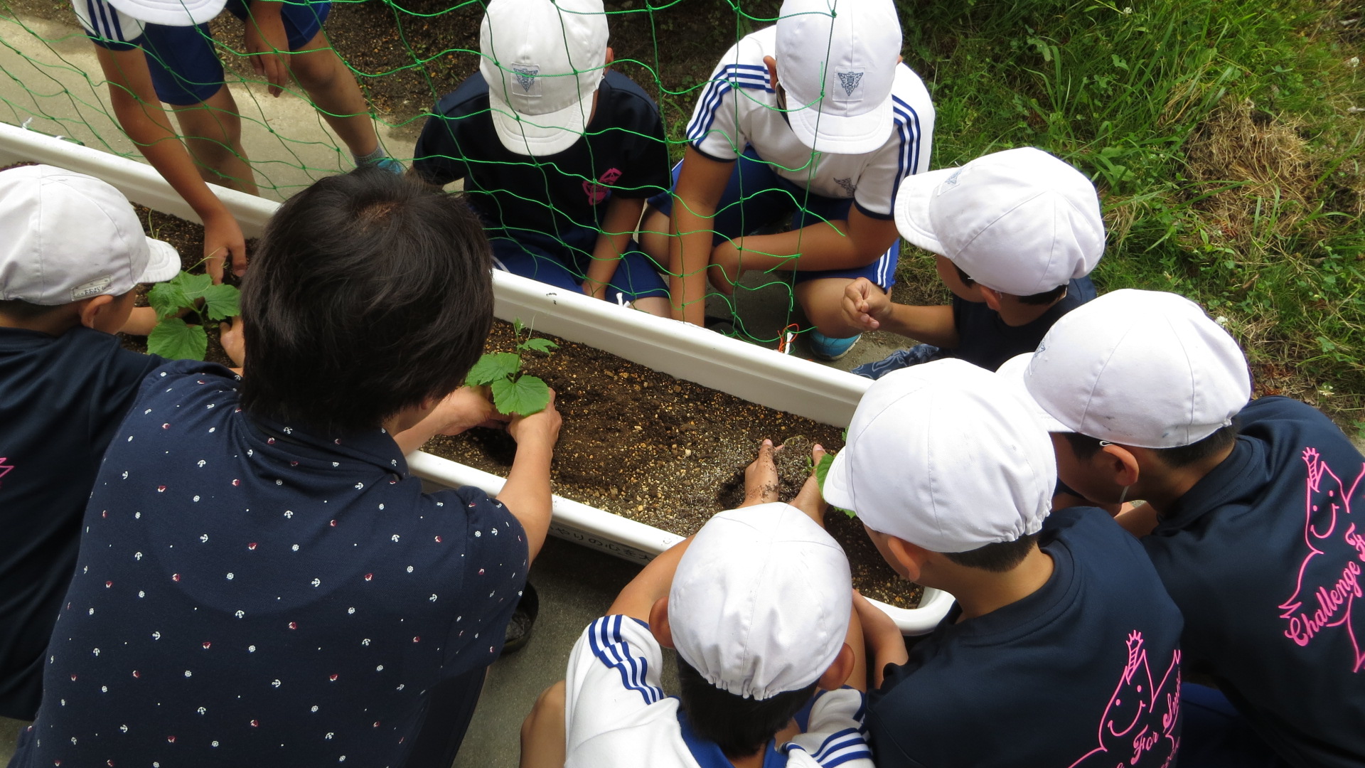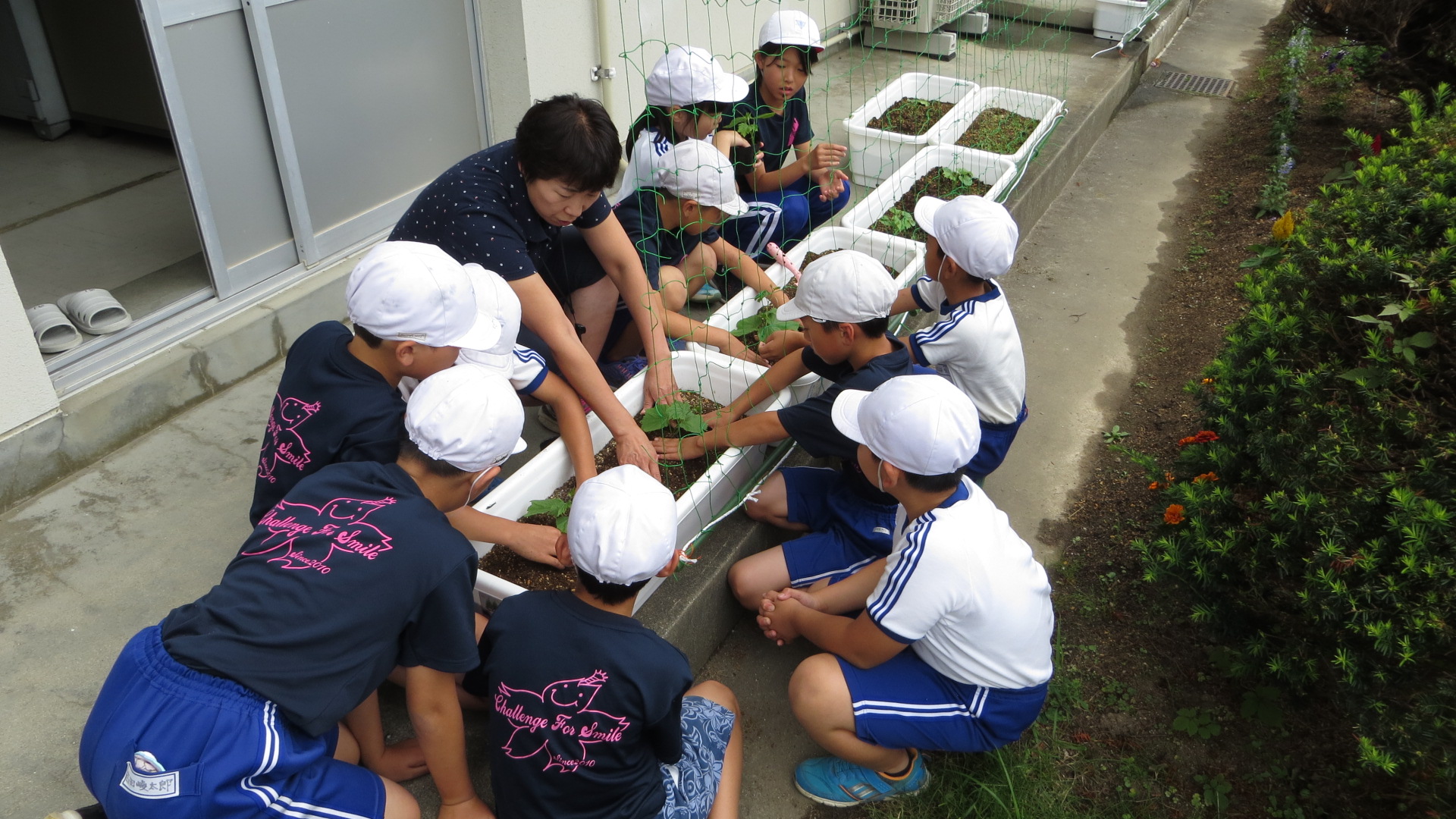 4校時に4年生が自分たちで種から育てたゴーヤの苗を、校長室前のプランターに植え付けを行いました。