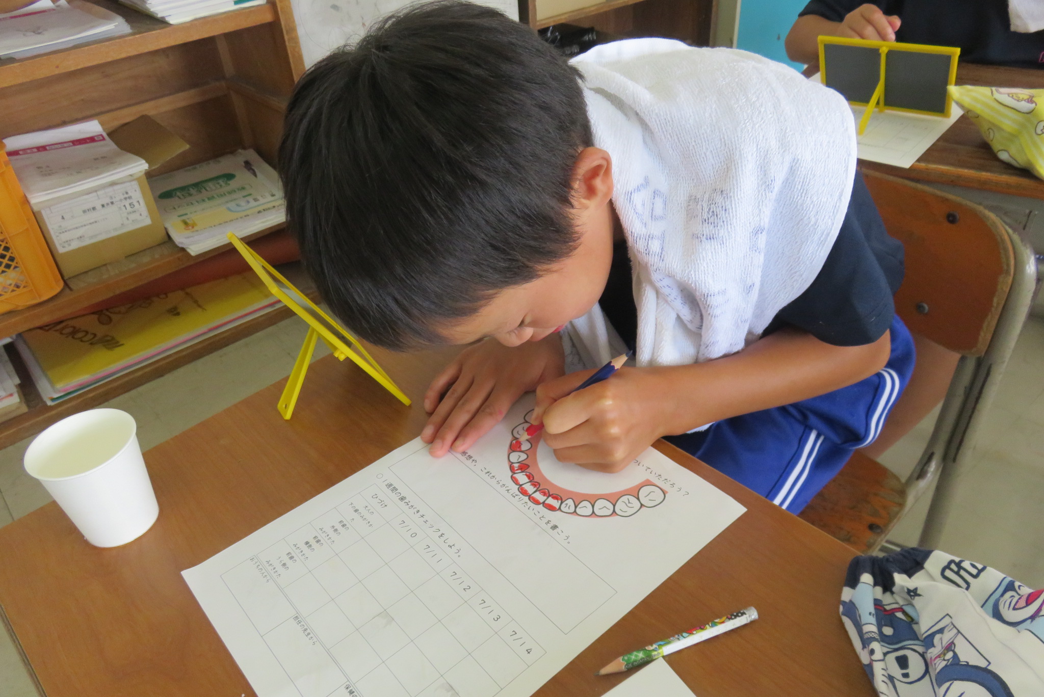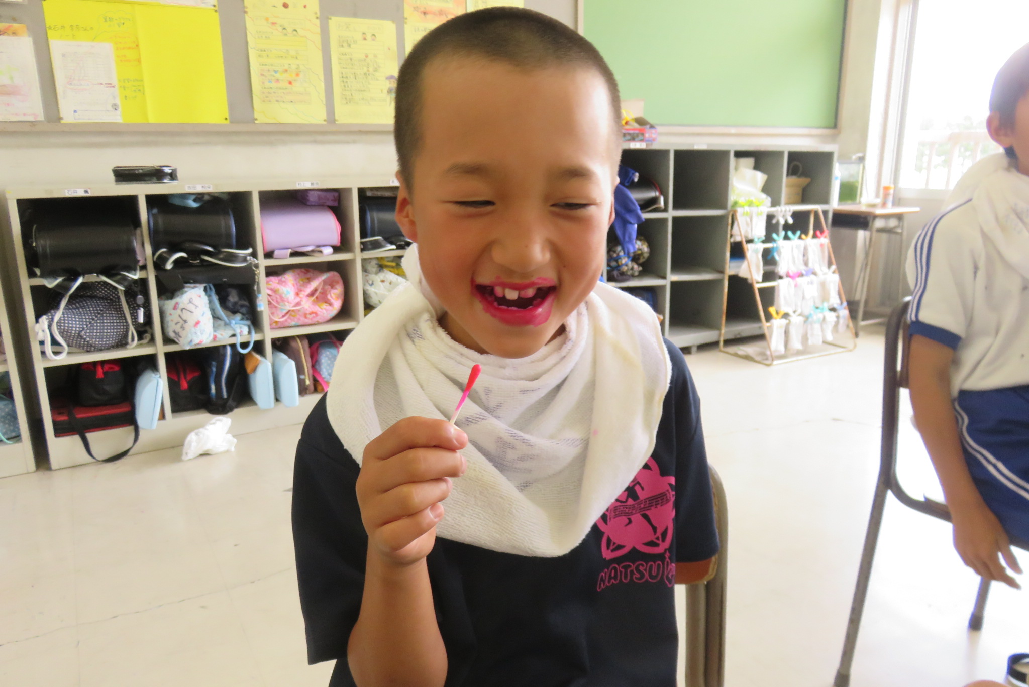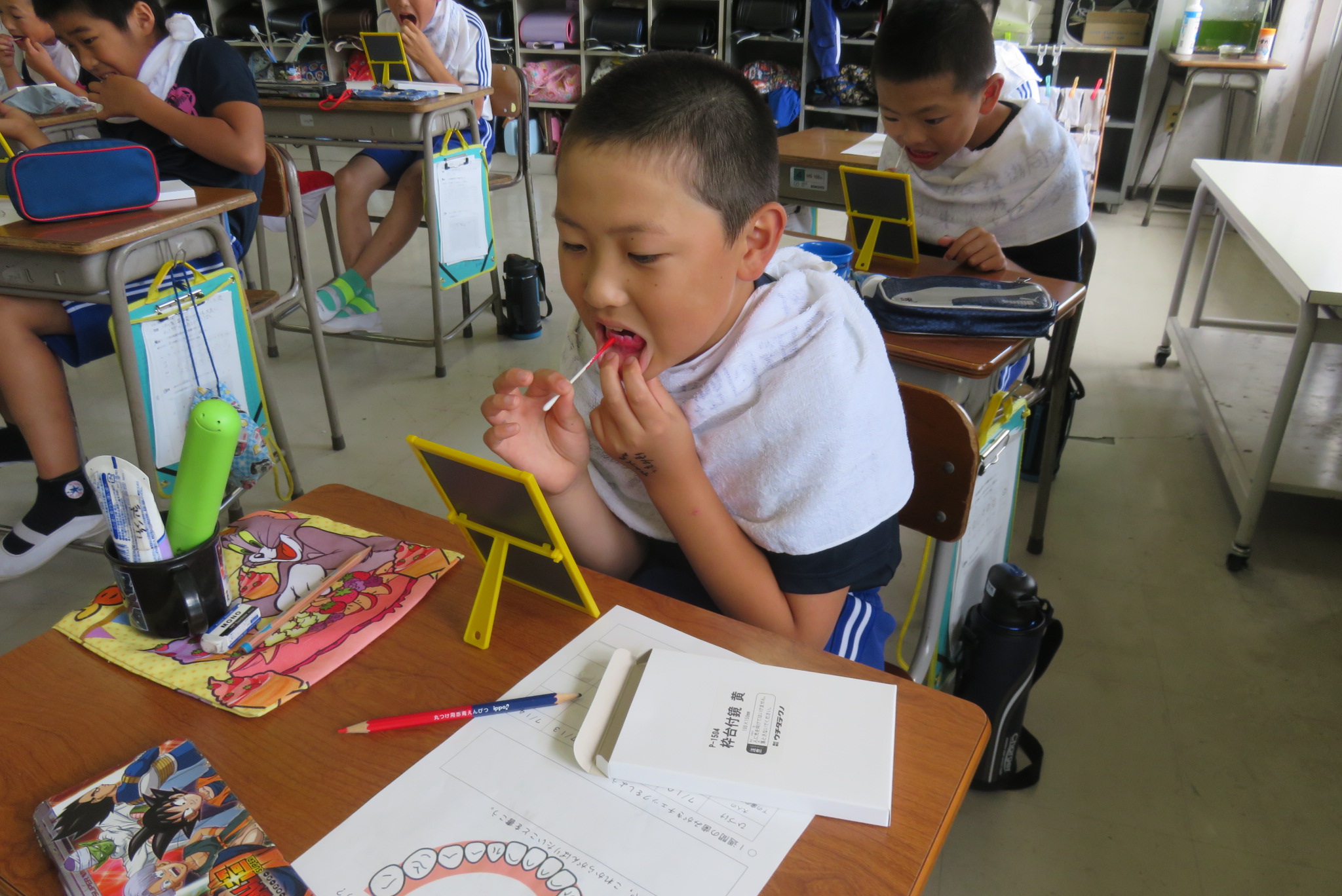 その後、染め出しを行い歯磨きの磨き残しを児童一人一人が確認しました。