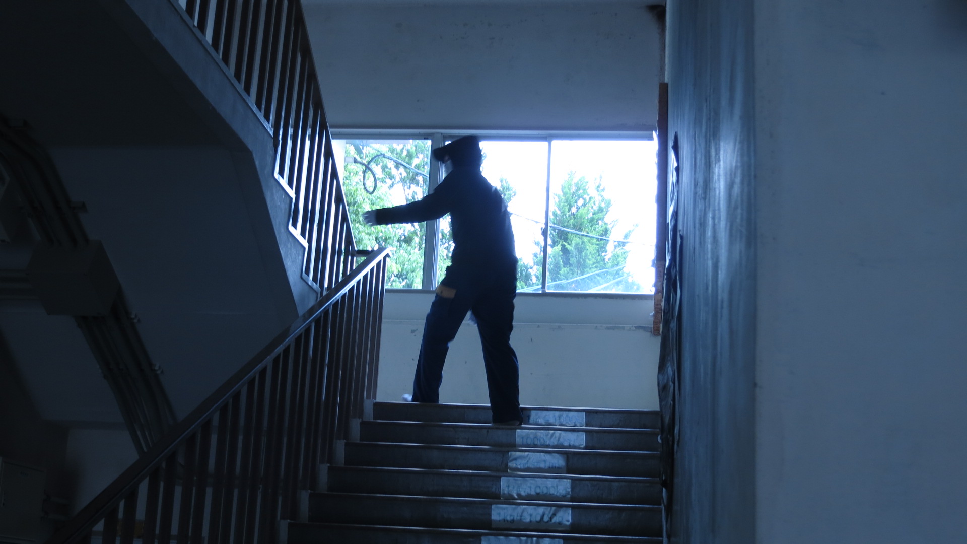 不審者役に駐在所の大越さんになっていただき、玄関から侵入した不審者が、大声を上げながら2階に上がり、2・3年教室に入るという想定です。