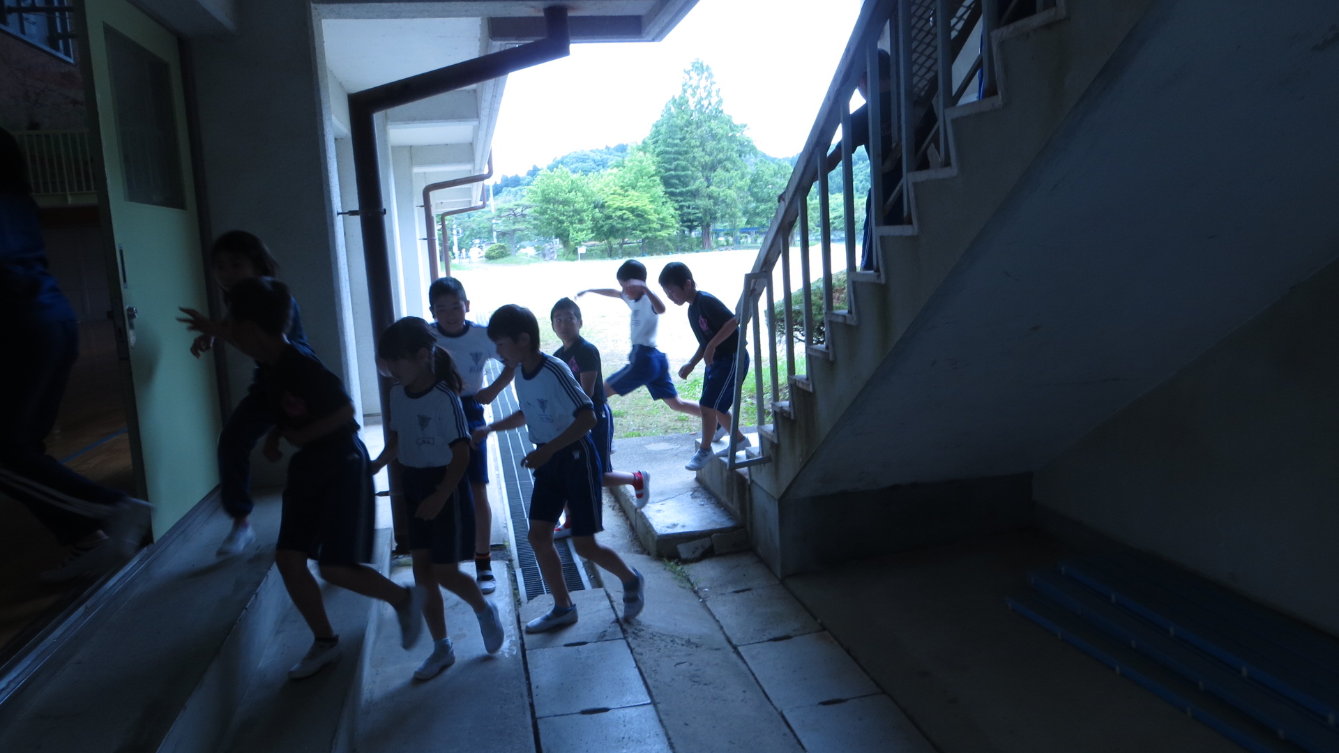 児童たちは先生の指示で素早く非常階段から体育館に避難しました。態度も真剣でふざける児童もなくスムーズに避難できました。