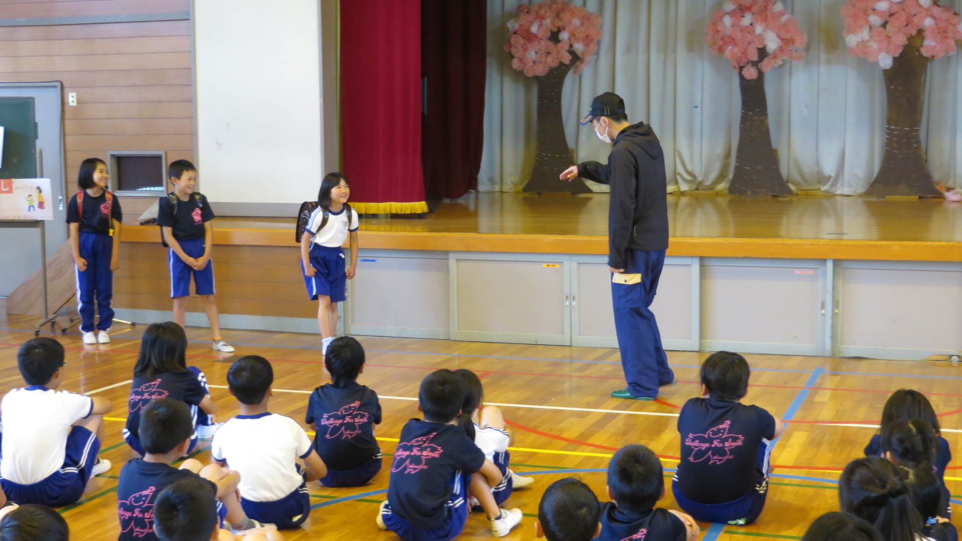 その後体育館で全体指導を行い、「いかのおすし」の確認や、下校中に不審者に声をかけられたときの逃げ方の練習をしました。