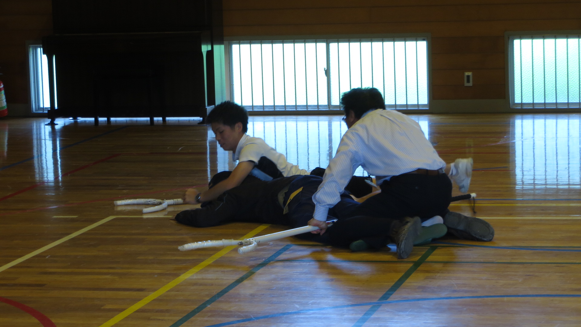 2年教室では、男の先生方で不審者を取り押さえる実地の訓練も行いました。