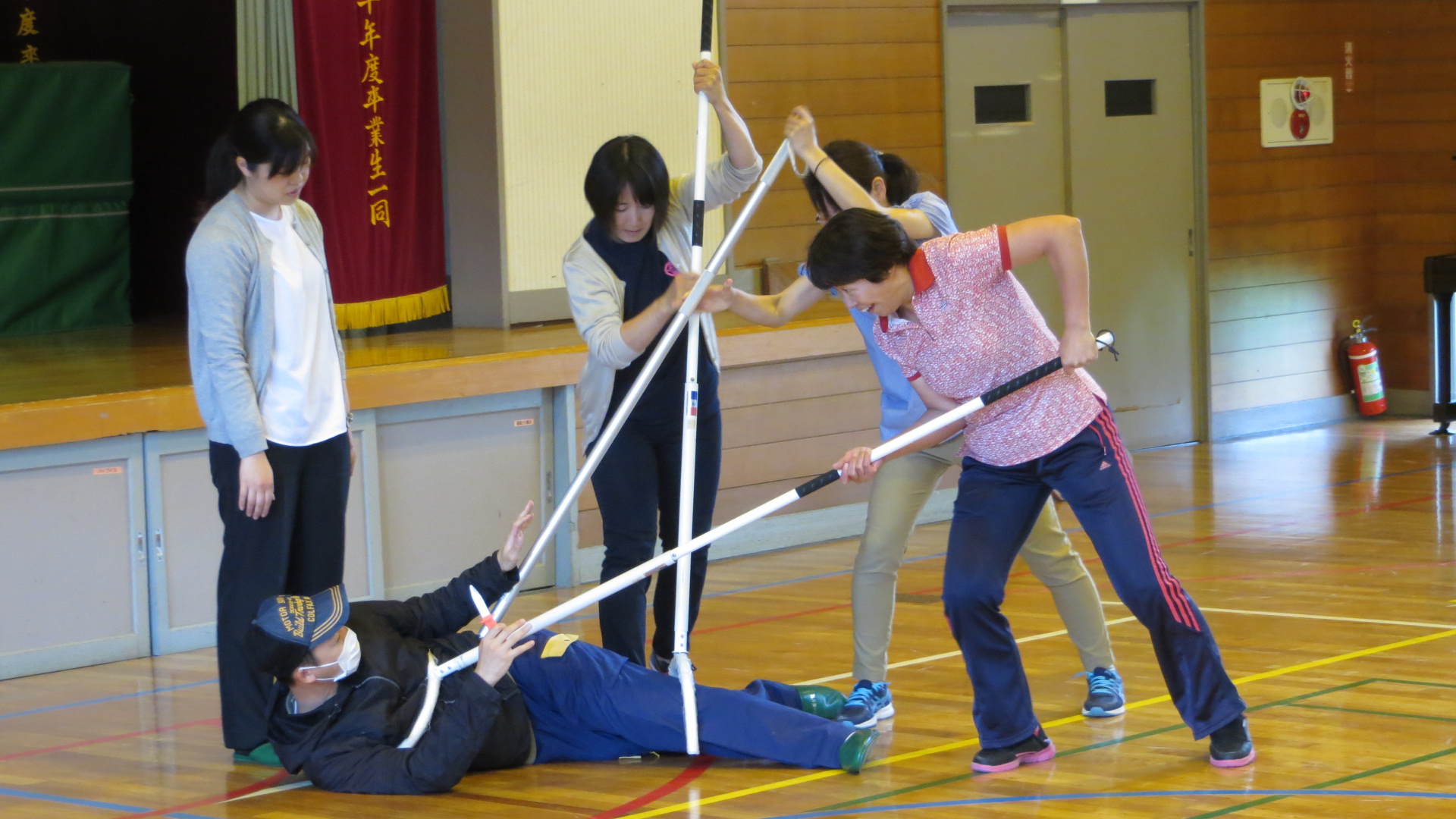 「さすまた」を使った不審者取り押さえの訓練も全校生の前で、男女の先生方で実施しました。