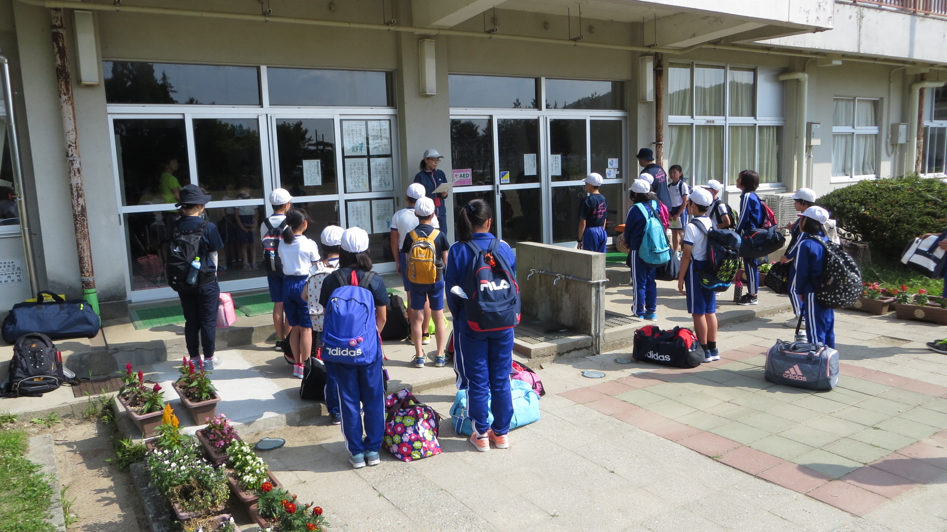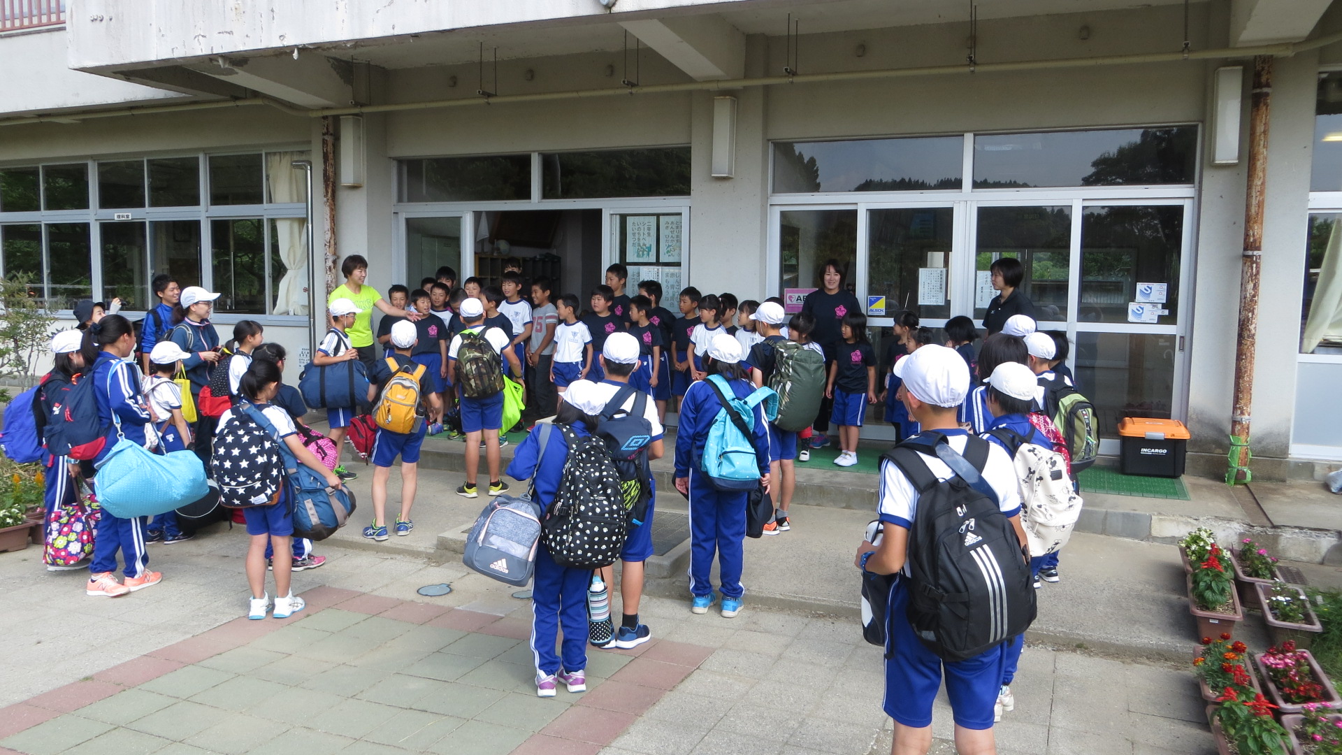その後、全校生が玄関で見送る中、元気に宿泊学習に出発しました。