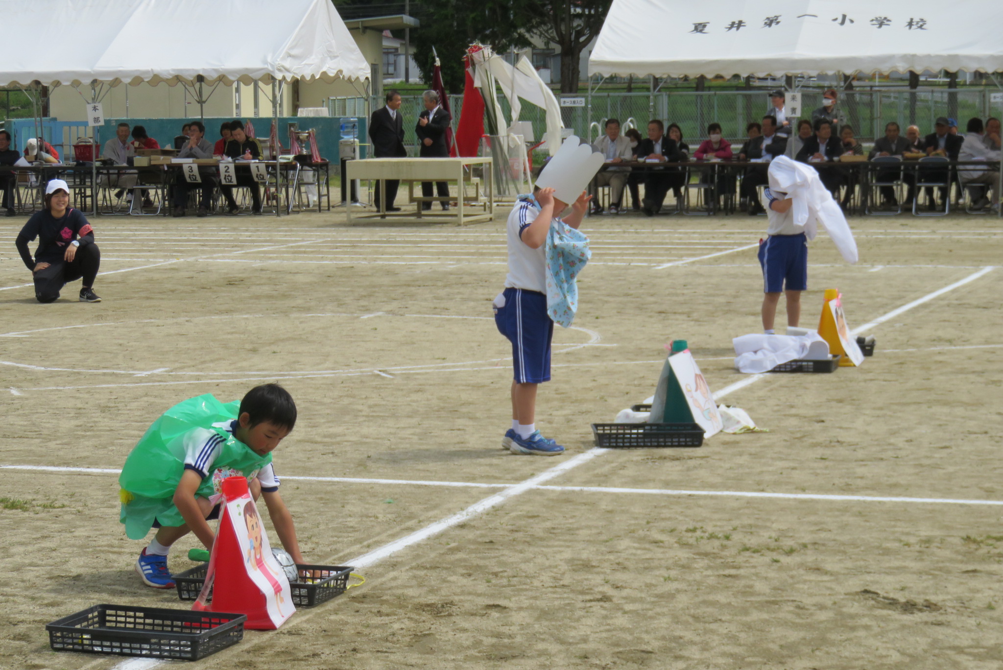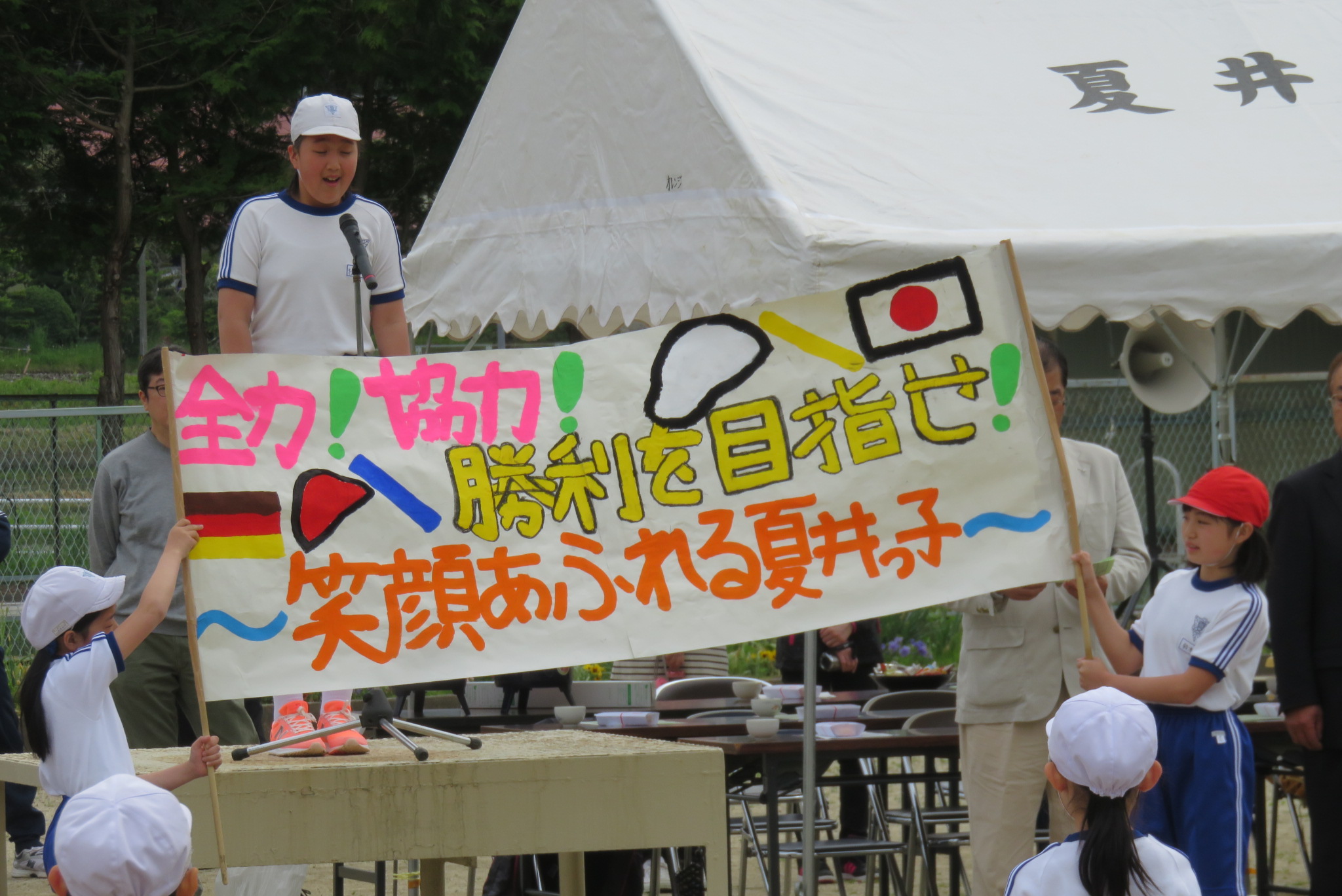 今年度のスローガン「全力、協力、勝利を目指せ!~笑顔あふれる夏井っ子~」のもと、全校児童は自分の種目に全力で取り組むばかりでなく、友だちの応援も一生懸命に行っていました。