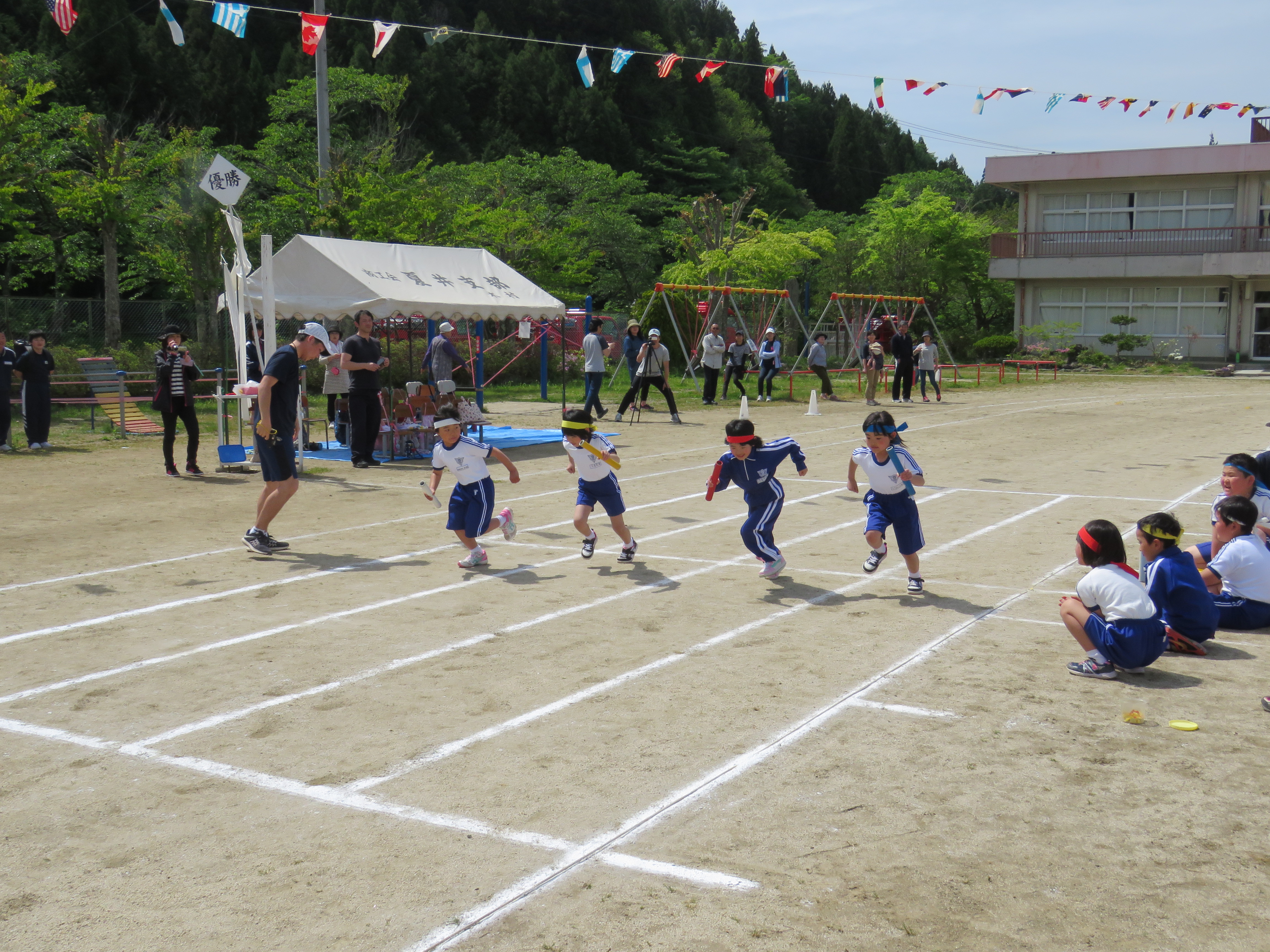 その他、区長会・PTA・消防団・青年団・老人会・交通安全協会・交通安全母の会婦人会・商工会・保育園等のバックアップもいただき大いに盛り上がった運動会となりました。心より感謝申し上げます。