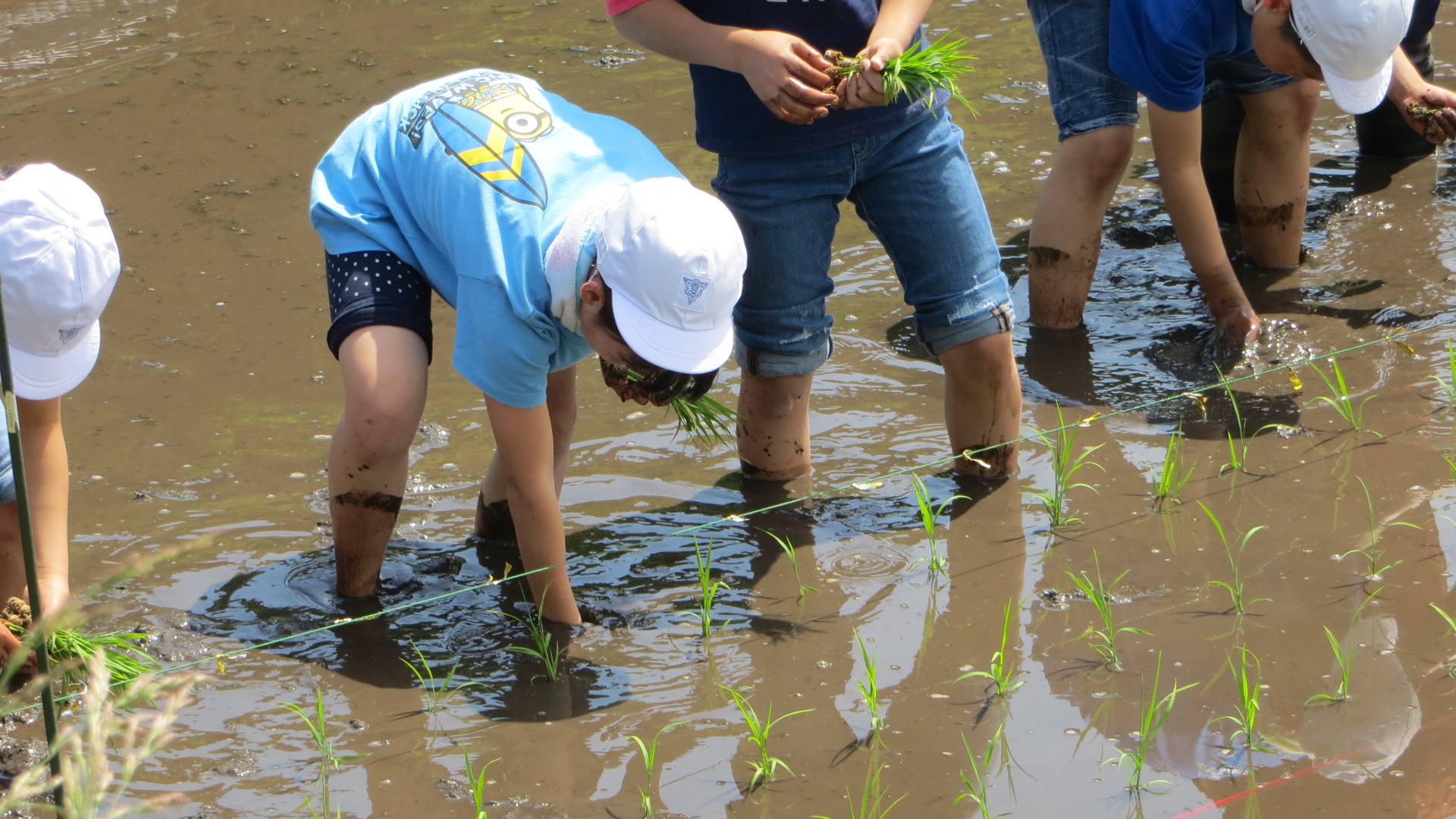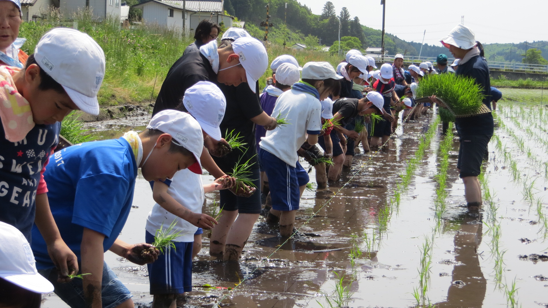 田植えについて今泉さんからお話をいただいた後、全校生が一列になって田植え体験を
