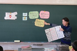 数学の授業ではトランプを使い、正負の数について学びました。英語では自分のことを英語で話したり、ほかの小学校の人と友達になることを目的に授業が実施されました。