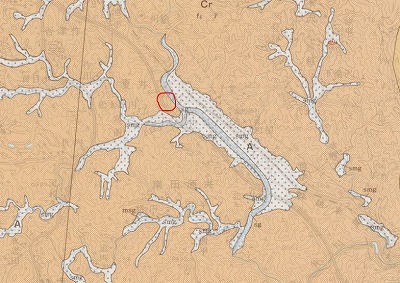 赤い丸が今回,5・6年生で地質調査をした場所です。こうして地質図をみても,いかに小野町が花崗岩でできているかが分かります。