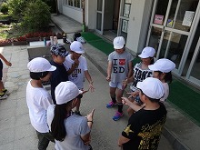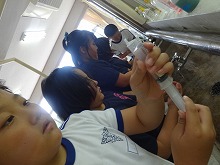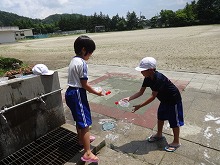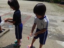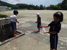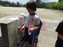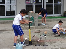 1年生が生活科の中で楽しく水鉄砲遊びをしました。実はこの楽しい学習が4年生の理科の学習につながっているのです。