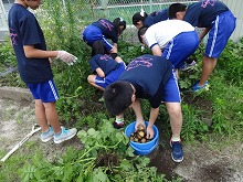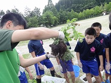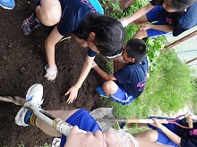 ベランダと畑で育てていたジャガイモを収穫しました。こんなに成長に違いがあるなんて・・・なぜそのようになったのか?話合いながら収穫しました。