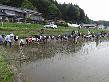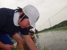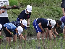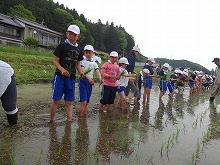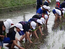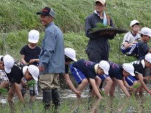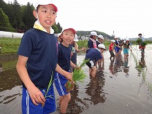 今日は,地域のみなさんと一緒に,学校田で田植えを行いました。