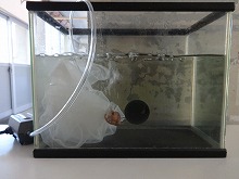 水槽の中にある,インゲン豆にエアーポンプで空気を送り込んだ状態で2~3日そのままにしました。発芽の条件である,空気・水(水槽の中なので大丈夫)・適当な温度だと・・・