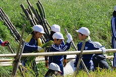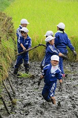 前日の雨でぬかるんだ状況の中,一生懸命稲刈りやはせがけ作業に取り組みました。10月には5・6年生による脱穀作業も予定しています。地域の皆さん,本当にありがとうございました。