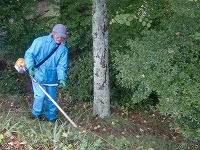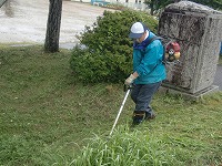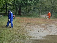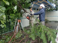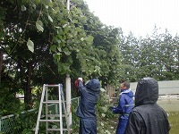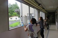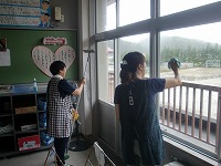 チェーンソーやのこぎりを使っての枝打ち、草刈り、体育館と校舎内の窓拭きなど、一時間とは思えないほど作業が進みました。本当に感謝申し上げます。