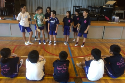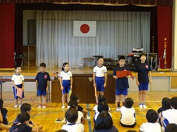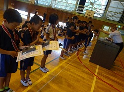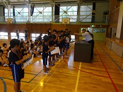 今日の全校集会の中で,夏休中に実施された町の水泳記録会の表彰式が行われました。