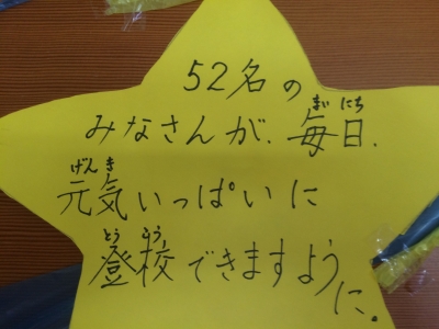 52名の子どもたちと、13名の先生方の願い事が、体育館の壁面に掲示してあります。