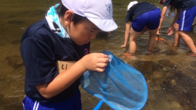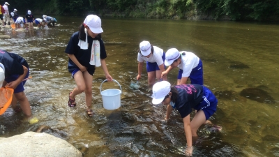 小川公民館の近くの夏井川で、水生生物調査をしています。