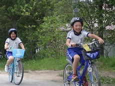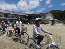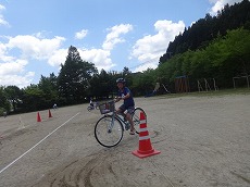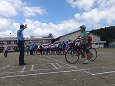 今日は,3~6年生の児童による自転車教室が行われました。朝,保護者の皆様の協力により持ってきていただいた自転車を町内の自転車店さんに点検していただきました。その後,夏井の駐在さんを講師としてお迎えして,自転車を乗るときのルールやマナー,保険についてなどのご指導をいただき,スラローム走行や8の字走行,横断歩道の乗り方などを確認しました。さらに,学校の外周に出て,実際の走行方法についても学びました。