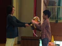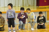 優勝は、さくらっこ4班でした。代表の1年生が、トロフィーを手にしました。