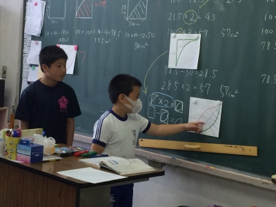 写真は6年生の子どもたちの、自分の考えを豊かに表現している様子です。黒板を子どもたちが自由に使い、自分の考えを表現しています。
