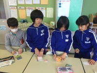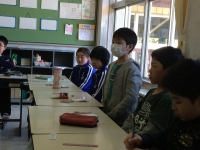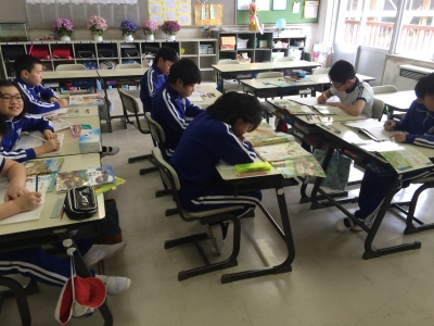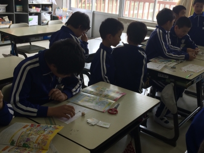 英語の学習をしていた時に、1年生が学校探検をしていました。