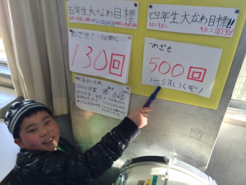 時間内に目標の回数を何回跳ぶことができるかを、子どもたち一人一人が目標として持って頑張っています。
