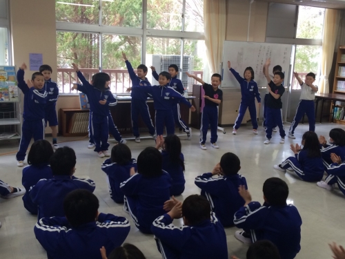 25日の全校集会で、一年生の学年発表がありました。「は、ほ、ふの字」「怠け忍者」の詩の朗読と、ダンスを元気いっぱい発表しました。