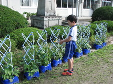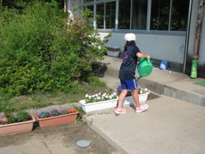 学校では、1年生が、育てているアサガオに水やりをしていました、また、ボランティアワーク委員会の子どもたちは、ロベリア、アゲラタム、ベコニア等に水やりをしてました。
