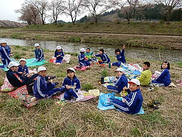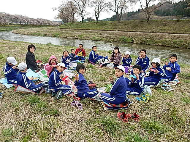 夏井千本桜も咲き始めました。1年生をむかえる会のあと、全校たてわりの「さくらっこグループ」でお花見弁当をみんなでおいしく食べました。