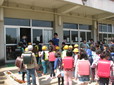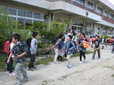 集団下校時、全校児童が昇降口前に通学班ごとに並びます。