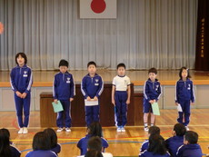全校集会で各学年の代表児童がめあての発表を行いました。