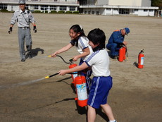 その後、田村消防署小野分署の署員さんのお話をお聴きした後、水消火器を使った初期消火訓練を行いました。