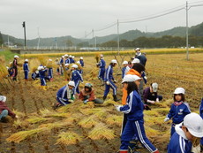 1日、全校生で学校田の稲刈りを行いました。