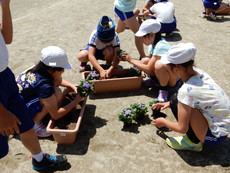 今日、学年ごとに花の苗をプランターに植えさせていただきました。