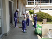 1年生も5年生や6年生にほうきの使い方などを教えてもらいながらがんばっています。