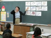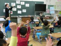 元気いっぱいの声が聞こえてきました。1年生が英語のお勉強をしていました。動物の名前を勉強していました。数枚を裏返しにして、たずねると子どもたちはしっかりと覚えていて、「fish」「monkey」などと英語でしっかりと答えていました。どんどん言葉を吸収する子どもの能力、はすばらしいです!