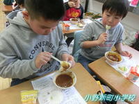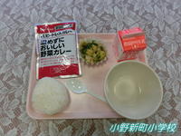 本日は、非常食体験給食でした。いつもは、温かくおいしい給食を食べていますが、今日はいつもと一味違います。レトルトの冷たいカレーを自分でお椀によそい、おにぎりをパクリ。給食当番は、手で野菜を紙カップに配膳しましたが、うまくよそえず四苦八苦していました。乾パンの味は、満更ではないが口の中の水分が奪われ、食べるのにこれまた一苦労でした。準備するのも食べるのにも苦労が付いて回りました。あたり前のように食べていた食事が恵まれていることに気づけたようです。