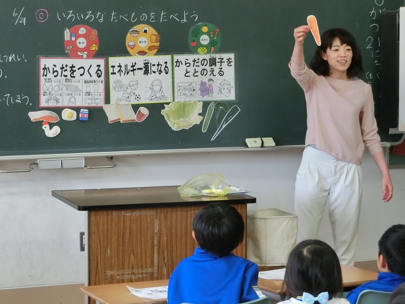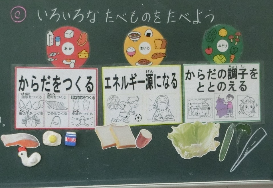 本日、栄養教諭の松本先生をお招きして、1年生の食に関する学習を行いました。赤(からだをつくる食べ物)、黄(エネルギー源になる食べ物)、緑(からだの調子をととのえる食べ物)と、3色でわかりやすく教えていただきました。「牛乳は?」ときかれると、「赤!」と元気に答えていました。ご家庭でも、「この食べ物は、何色?」ときいてみてはいかがですか。