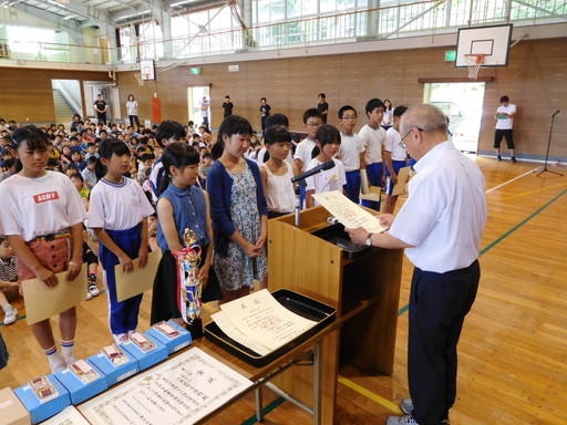 2018年6月27日 14時30分本日の全校集会では、今月行われた小学生陸上競技交流大会田村地区予選会や交通安全子供自転車大会県南方部大会などの表彰が行われました。校長先生から入賞した児童に、立派な賞状やトロフィーなどが授与されました。